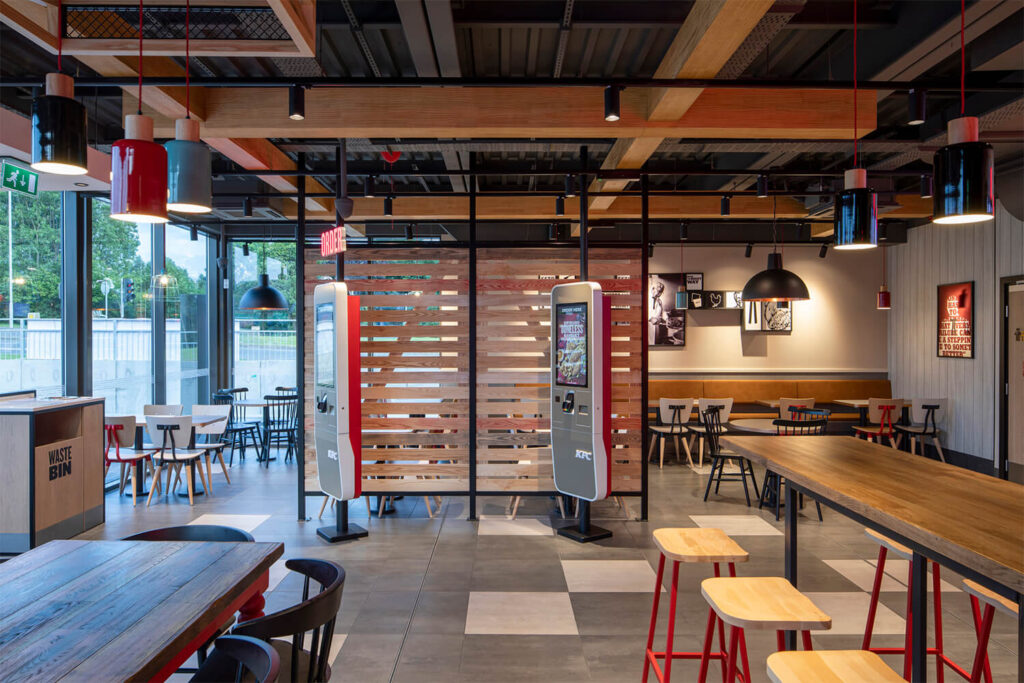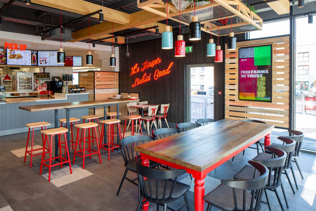 Working alongside the KFC in-house design team we assisted with the look, feel and specification of all fixtures and fittings, manufacturing counters, free standing bench seating, café bars, low level tables, ceiling rafts and wall panelling. Manufacturing for both the equity and franchise estate of restaurants.